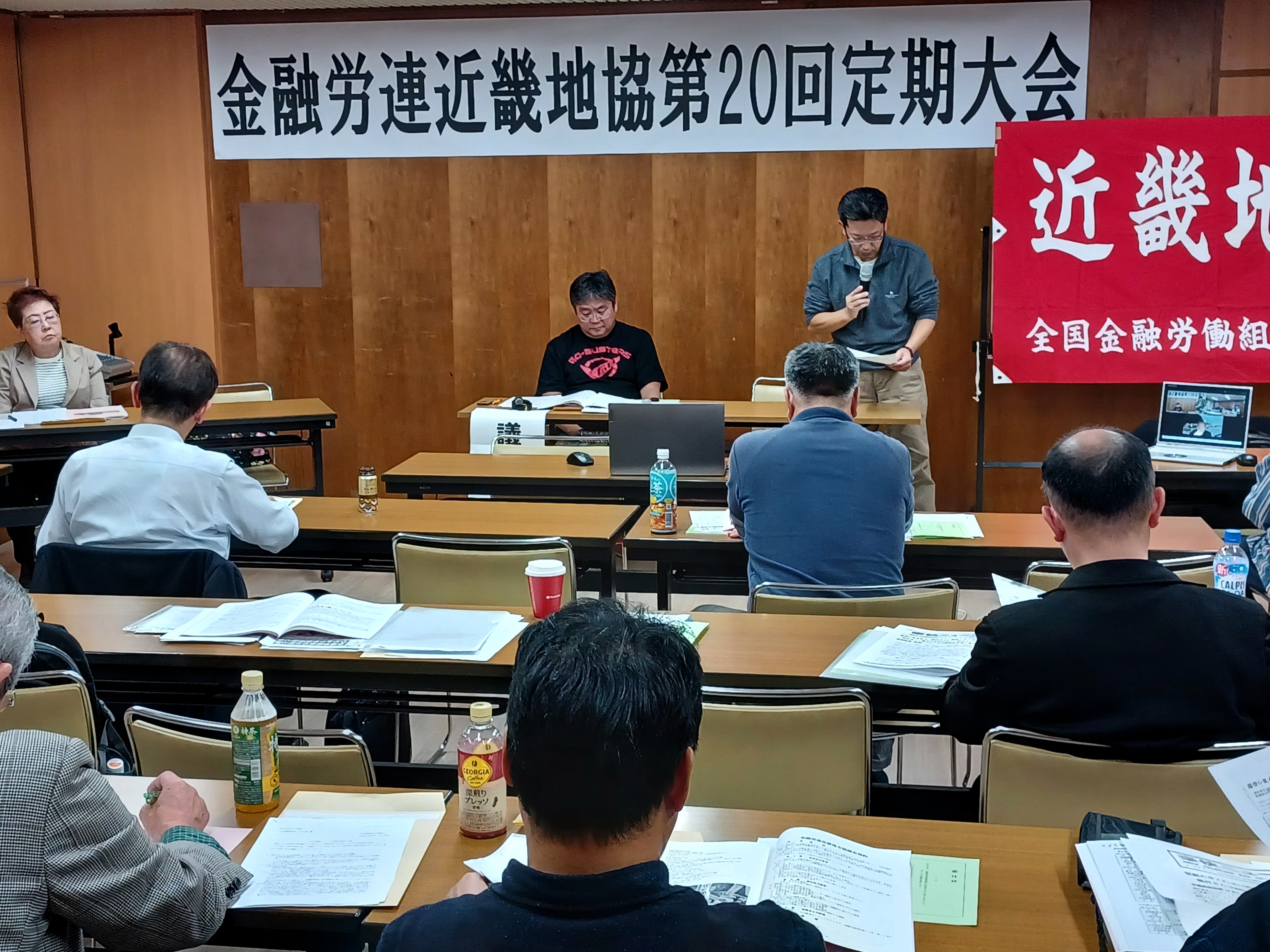 主催者あいさつで、岡野議長は「ここ数年でやっと賃上げが当たり前と言われるようになってきたが、物価高騰には追い付かず、実質賃金は上がっていない。社会保障を含めて生計費原則を重視した春闘・秋闘に取り組んでいきたい。新政権は労働時間の規制緩和など、財界の意向を受けた方向で働き方『改革』を狙っている。学習を強め、金融産別としての存在感を発揮していこう」と訴えました。 来賓の大阪労連・福岡議長は「考え方の違う人たちとは話し合うことさえしない」ことを基本方針として表明していてる日本維新の会と高市自民党との連立政権の『反民主』的な危険性を指摘したうえで、「トリクルダウン(大企業が儲かれば中小業者や庶民も潤う)というウソがハッキリしたはずのアベノミクスをまたぞろ復活させようとしている。今回引き上げた最低賃金では年収200万円余りに過ぎず、いつまで経ってもワーキングプアから脱出できない。大阪での最低生計費調査でも時給1800円以上は必要という結果が出ている。誰もが安心して暮らせる社会を実現するために労働組合が支持を大きく広げて、大幅賃上げをかちとろう」と呼びかけました。 具体的な要求を掲げた交渉で前進 近畿地協幹事会からの議案提案に続いて、討論が行われ、7名が発言しました。 心身痛め勤務不能の仲間を守るとりくみ 「退職強要」などもあって心身共に体調を崩し、休職を繰り返してきたKさんを、一方的に「正職員」から「嘱託職員」に切り替え、今度は「退職」を予告するなどしてきたことに関して、従業員組合が「労基法違反の人権侵害」として採りあげ、Kさんの無期雇用転換を勝ち取り、退職予告の事実上の撤回となりました。 さらに組合との協議抜きでの雇用形態の不利益変更を強行したことで生じた損失補填(賃金差額)を要求して交渉を進めています。 「労働協約違反の人事異動」解消へ 京都北都信金では従業員組合との人事異動に関する労働協約で「組合三役の本店・本部勤務」となっていましたが、近年、従組三役のすべての支店勤務が常態化していました。 今回、Kさんの問題などで、これまでの経過を熟知しているOBである金融ユニオン京都北都信金分会の仲間にも相談し、委任団交を開催する中で、坪倉書記長の本店異動が実現し、人事異動に関する協約違反状態も解消されることになりました。 この間、組合が労働局などの行政機関や弁護士への相談・告発に粘り強く取り組み、企業内だけの狭い視野での運動を外に広げることに一歩踏み出したことや「職場で泣いてる人はいないか」点検の中で、弱い者いじめの実態が浮き彫りになってきたこと、労使間の力関係をこれまでの「経営者と1労働者」から「経営者とOB・上部団体の組合役員・現役労働組合員」に広げ真の労使対等に近づけたことなどが教訓としてあげられます。 「障害者雇用者」に6年間で6回も労災事件発生 (りそな銀行) りそな銀行で「障害者雇用」として雇用されたYさんは採用されて働けなくなって退職を余儀なくされた2025年7月末までの6年間で労災関連事故を6回も体験しました。通勤途上のラッシュでの事故、行内エレベーター事故、細かい字の連続作業による目の事故、職場でのパワハラによる心の病等々、りそな銀行の障害者雇用に対する「合理的配慮」の欠如で、6年前の入行時は、通勤も可能であった体力が、整形外科、心療内科、眼科等の治療を受けても枚方と京橋の京阪電車の通勤さえも困難な状況に陥り、いまだ就業への見通しさえ立っていない再起不能状態になっています。 金融ユニオンは、きちんとした「謝罪」と破壊された労働者の生活に対する「補償」を求めて交渉を続けています。 その他、金融ユニオン前身の「近信労」時代も含め40年近い組合加入歴を持つ大阪シティ信金の小中幸子組合員が65歳以降の雇用確保に向けて、初めて大会で緊張しながら訴えるなど、7名の発言者全員が参加者に感動を与える内容のものとなりました。 ★ ★ 26年度から「一般会計」と「不当弾圧会計」を一本化する規約改定の4号議案も提案され、会計監査を含めたすべての議案が、出席代議員の全員一致で採択されました。 次に役員選挙が行われ、新役員が選出されました。選挙結果が坪倉選挙管理委員長から報告され、各組織から推薦のあった幹事の承認も行なわれました。 大会で選出・承認された新役員は次のとおりです。